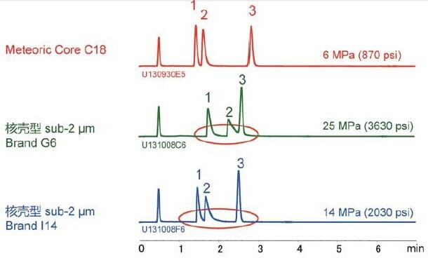 Meteoric Core C18與常規(guī)使用的全多孔型C18相比,在相同條件下可使分析時間縮短至2/3。因其具有卓越的分離能力,即使將流速提高1倍,仍可維持高效的理論塔板數狀態(tài)并使分析時間縮短至1/3,而此時色譜柱背壓不足5000psi,與普通Sub-2um色譜柱相比,色譜柱背壓更低的Meteoric Core C18為HPLC和UHPLC的使用分析中提供了高性能高生產性的新選擇。