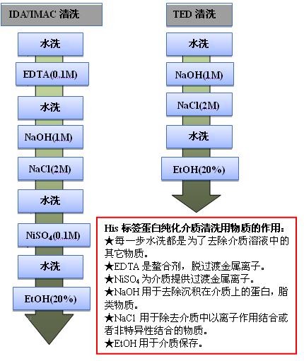 過渡態金屬離子(Cu2+>Ni2+>Zn2+>Co2+ )能夠與電子供體,如N、S、O 等原子以配位鍵結合,金屬離子上剩余的空軌道是電子供體的配位點,在溶液中會被水分子或陰離子占據,當蛋白質表面氨基酸殘基(His)與金屬離子的結合力較強時,氨基酸殘基的供電原子就會與金屬離子結合形成復合物,取代原先結合的水分子或陰離子,這樣就能使蛋白質分子結合在固體表面。His標簽蛋白的His和介質結合,由于蛋白質表面的氨基酸的種類、數量、位置和空間構象不同,因而具體使用時根據金屬配基的親和力大小不同,選擇不同的金屬配基進行分離純化。