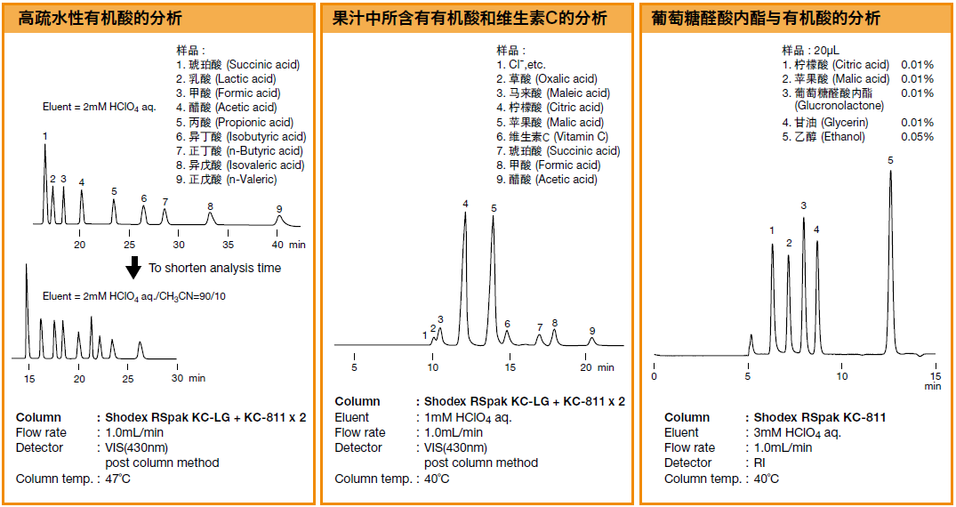 RSpak KC-811色譜柱是以聚苯乙烯-二乙烯基苯為基質的。它是用離子排阻法進行有機酸分離的色譜柱。可用于柱后法(post column method)進行高檢測靈敏度分析。