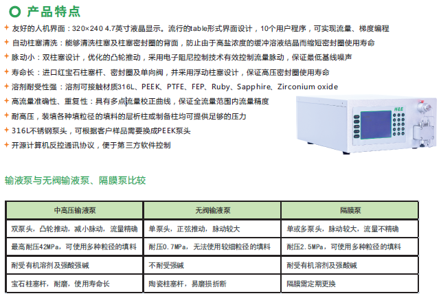 柱塞泵是目前液相色譜主流的輸液?jiǎn)卧貏e是雙柱塞往復(fù)泵。它有一個(gè)精心設(shè)計(jì)的偏心凸輪,用同步電機(jī)或變速直流電機(jī)驅(qū)動(dòng)偏心凸輪,偏心凸輪再推動(dòng)兩活塞作往復(fù)運(yùn)動(dòng)。偏心凸輪短半徑端所對(duì)應(yīng)的活塞向外伸,使該活塞的下單向閥打開(kāi)吸入流動(dòng)相,與此同時(shí),偏心凸輪的長(zhǎng)半徑端所對(duì)應(yīng)的另一活塞被推入,使其上單向閥打開(kāi),并將流動(dòng)相送至色譜柱。具有操作方便、流速穩(wěn)定、壓力脈動(dòng)小、故障率低的優(yōu)點(diǎn)。根據(jù)流量大小一般可分為分析型和制備型。