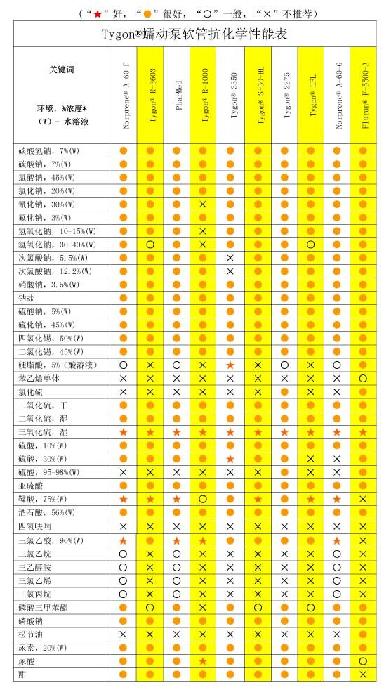 4、溫度:泵頭管不同材料有不同的溫度表現。有些管材如硅橡膠具有較寬溫度承受范圍,對高溫、低溫過程均適宜;而有些管材如Tygonˉ 及 C-Flexˉ則只適于某一較小的溫度范圍。最終用戶在選擇管材前,應先弄清系統中的最高溫度和最低溫度,然后確保所選泵管安全工作于此溫度區間。