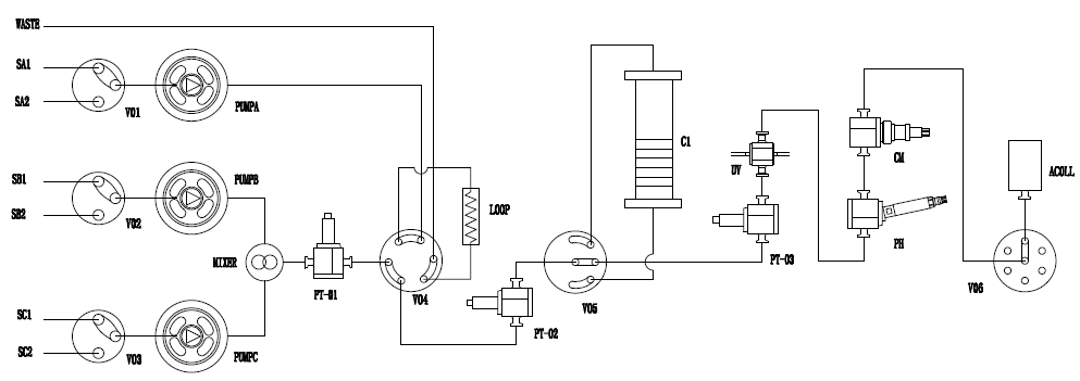 * 本系統(tǒng)采用流路最小化設計,器件之間十分緊湊,整體流路容積很小。流路為標準手緊接頭連接固定,方便快捷的同時,大幅度減小系統(tǒng)死體積。