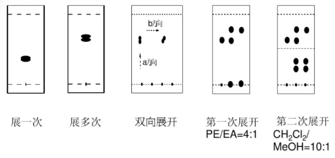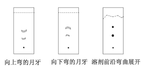 ※? 有羧基官能團存在的化合物:在展開劑中加入微量的醋酸(乙酸或甲酸的使用,一方面增大展開劑極性,另外也可以抑制硅膠上羥基的作用,減少拖尾)