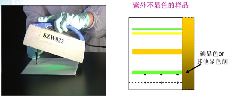二照:在紫外燈下觀察有無暗斑或熒光斑點