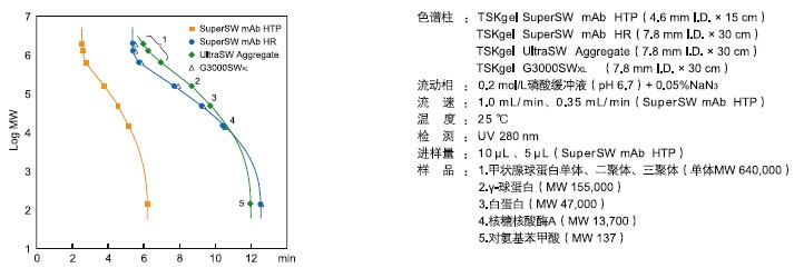 1. TSKgel SuperSW柱有內(nèi)徑為4μm的顆粒,能實現(xiàn)最高分辨率。窄至4.6mm內(nèi)徑的柱能在一定量的樣品質(zhì)量范圍內(nèi)提高高靈敏度。